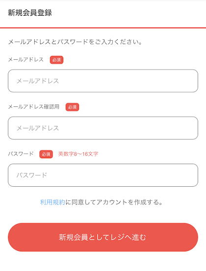新規会員登録画面でメールアドレスとパスワードを入力して、「新規会員としてレジへ進む」をタップします。