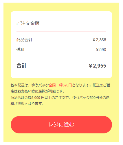 送料は、ゆうぱっく全国一律590円。合計5,000円以上の注文で送料無料になります。