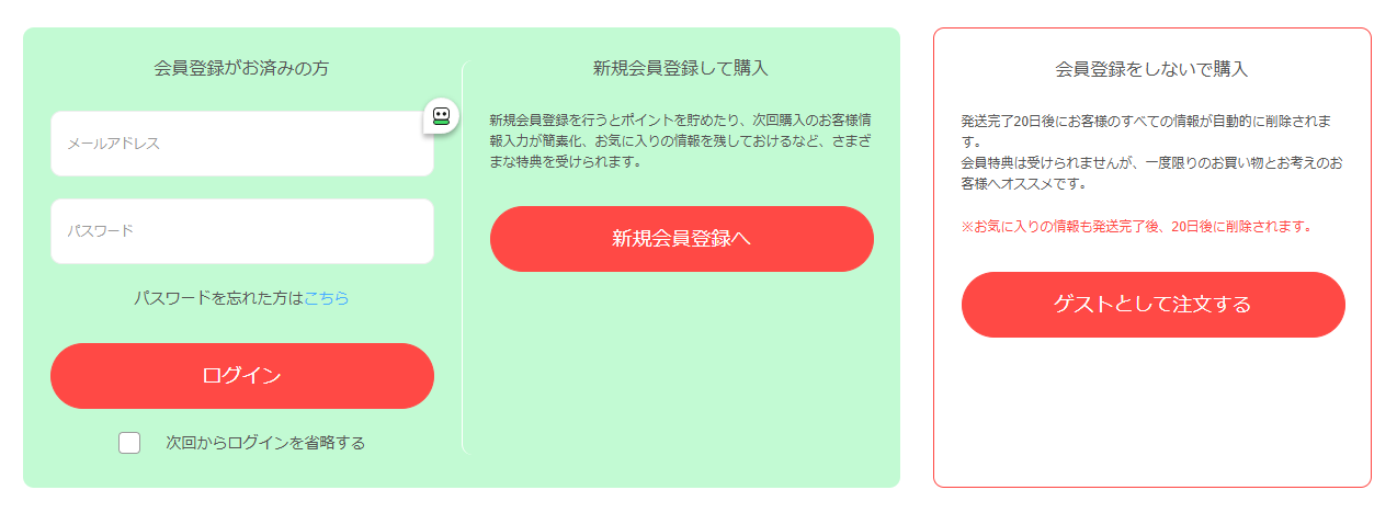 会員登録すると、ポイント以外に次回購入のお客様情報入力が簡素化できて、お気に入りの情報を残しておけます。